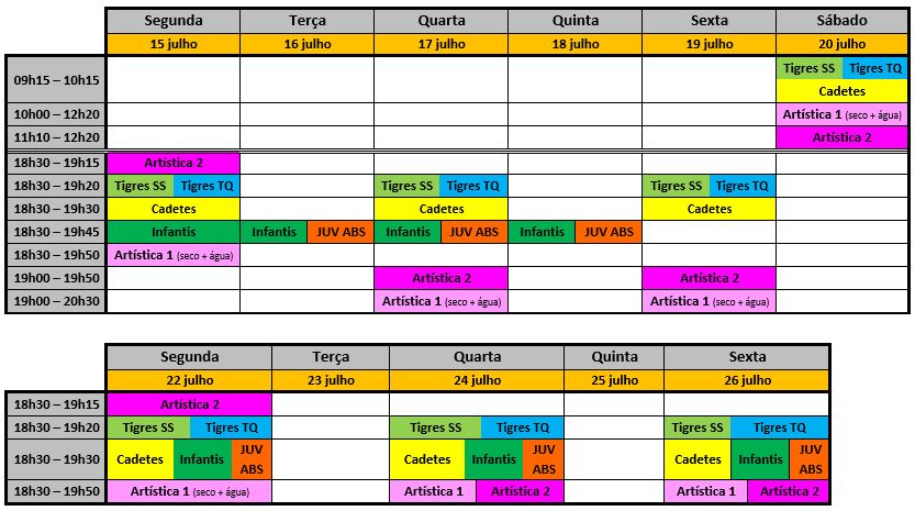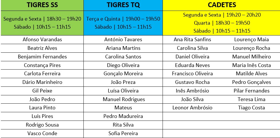 Para os grupos Tigres SS, Tigres TQ e Cadetes, a lista de nadadores e horários para a época desportiva 2024/2025 são os apresentados em baixo. As listas de nadadores, bem como os horários apresentados estão sujeitos a alterações, sempre que se justificar.